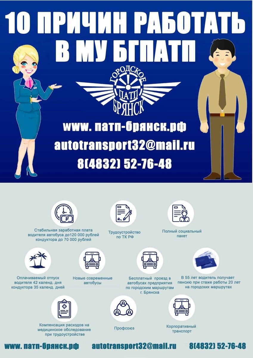 Свежее заявление пресс-службы мэрии Брянска о зарплате водителя муниципального автобуса до 120 тысяч рублей в месяц разозлило читателя “БВ”, работающего как раз в городском пассажирском автотранспортном предприятии. Таких денег он отродясь там не видел, хотя работает на износ. Сегодня, 20 февраля, Брянская городская администрация назвала сразу 10 железобетонных причин, почему в ПАТП – муниципальное пассажирское автотранспортное предприятие должны потоком повалить водители. Тут и официальное трудоустройство, и полный соцпакет, и 42-дневный отпуск под пальмами (именно они нарисованы в опубликованной “зазывалке”), и бесплатный проезд вне работы на городских автобусах, и даже профсоюз. Правда, вовсе не “бесплатный”, как мы узнали. Но главная причина, по жалуй, по которой новые водители должны прийти на работу в Брянское городское ПАТП – это поражающая своим размером зарплата. С хитрой приставкой “до”, конечно, но все же. Эта зарплата способна поразить в сердце любого трудолюбивого брянца,