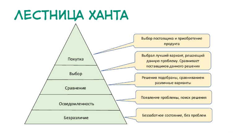 Любая воронка продаж - это лестница Ханта. Она демонстрирует, как человек двигается по пути клиента и прогревается.