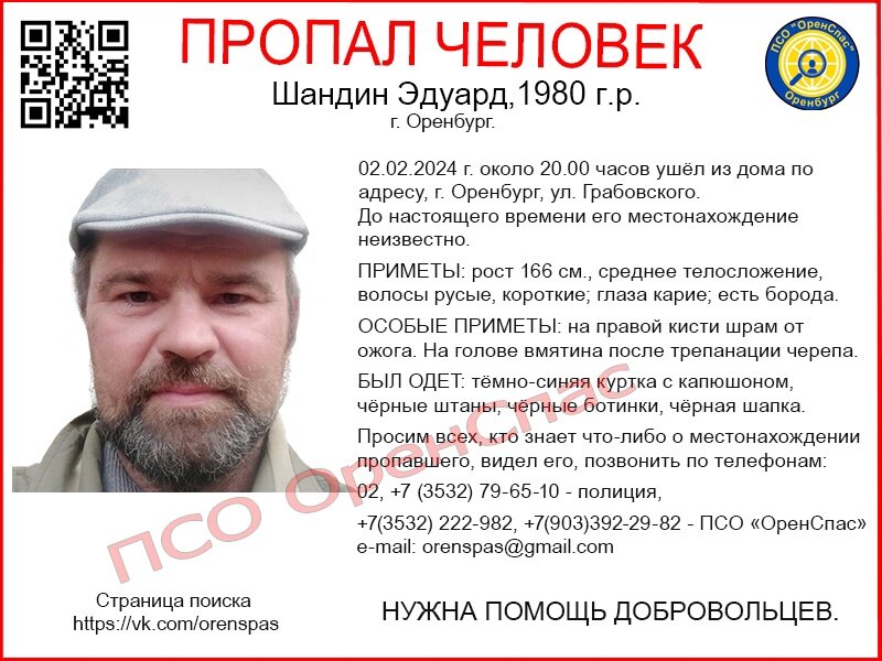 Без вести пропавший житель областного центра до настоящего времени не найден, сообщили «Оренбург Медиа» в ПСО «ОренСпас». Шандин Эдуард 1980 года рождения 2 февраля 2024 года около 20 часов вечера ушёл из дома по улице Грабовского и не вернулся. Родственники мужчины обратились в полицию и к поисковикам. Пропавший был объявлен в розыск. Поисковые мероприятия не дали результата, до настоящего времени местонахождение мужчины не установлено. Приметы: рост 166 см., среднего телосложения, короткие русые волосы, карие глаза, борода. Особые приметы: на правой кисти шрам от ожога. На голове вмятина после трепанации черепа. Был одет: тёмно-синяя куртка с капюшоном, чёрные штаны, чёрные ботинки, чёрная шапка. Всех, кто что-либо знает о местонахождении пропавшего или видел его, просят позвонить по телефонам: 02, +7 (3532) 79-65-10 — полиция, +7(3532) 222-982, +7(903)392-29-82 — ПСО «ОренСпас».