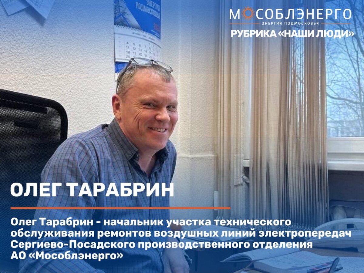 Олег Тарабрин - начальник участка технического обслуживания ремонтов воздушных линий электропередач Сергиево-Посадского производственного отделения АО «Мособлэнерго». Общий стаж работы в электроэнергетике более 30 лет. С детских лет Олег Владимирович интересовался у старшего брата – электрика, какие процессы заставляют лампочку гореть и откуда берется электричество? После окончания училища энергичного и любознательного молодого специалиста приняли на работу в электросеть электромонтером. Обслуживанию воздушных линий Олег Тарабрин посвятил 28 лет жизни. Затем получил предложение стать начальником участка. Олег Тарабрин постоянно работает над повышением квалификации. Коллеги отмечают, что в нём хорошо сочетается скромность с высокой требовательностью к себе и своей должности. Руководство не единожды отмечало ответственность Олега Владимировича в решении производственных вопросов и настойчивость в достижении поставленных задач. В 2018 году начальник участка был награжден почетной грамотой