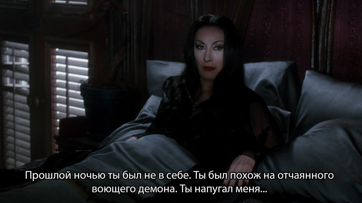 А конкретно - в одной маленькой детали, когда Гомес обращается к Мортише со своим фирменным "Кара миа", но делает это в вопросительном тоне. То есть, он не говорит ей: "Давай, твоя очередь", а спрашивает: "Ну как, не хочешь присоединиться к этой игре?"
