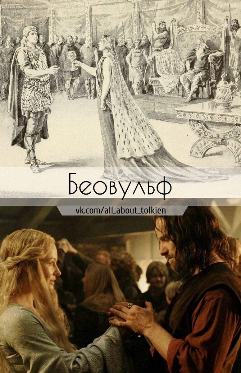 1. "Беовульф" — англосаксонская эпическая поэм VII — VIII века. Мало, кто не слышал о "Беовульфе", повлиявшем на произведения Толкина. Отсюда и "Медовый Зал" (Медусельд) короля Рохана, Теодена, который в Беовульфе назывался Хеорот. Здесь можно встретить знакомые названия рас: орки, эльфы, энты; и географические объекты, такие как Ортханк. А Беорн по своей сути похож на Беовульфа. Исследователь Толкина Джон Гарт в добавок сравнил Голлума с Гренделем.
