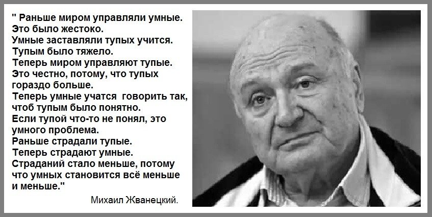 Мне тут вчера папа (помните я писала что он у нас Большая Ленинская библиотека) подкинул идейку для статьи. Прочитал мне одно высказывание М.Жванецкого : "Раньше миром управляли умные. Это было жестоко. Умные заставляли тупых учиться. Тупым было тяжело. Теперь миром управляют тупые. Это честно, потому что тупых гораздо больше. Теперь умные учатся говорить так, чтоб тупым было понятно. Если тупой что-то не понял, это умного проблема. Раньше страдали тупые. Теперь страдают умные. Страданий стало меньше, потому что умных становится все меньше и меньше» Вот я и задумалась. Как все верно сказано. Вот даже на примере Дзен. У кого больше всего подписчиков и просмотров - у тех кто обсуждает шоу-бизнес, перебирает из грязное белье, выкладывает какие-то глупые приколы, или еще лучше ест на камеру. Еда на камеры это вообще сейчас стало панацеей. Ну ладно бы еще при этом какие умные мысли высказывали, а то сплошная глупость и чавканье, плюс еще к этому новое веенье в в этом виде "искусства" - ал
