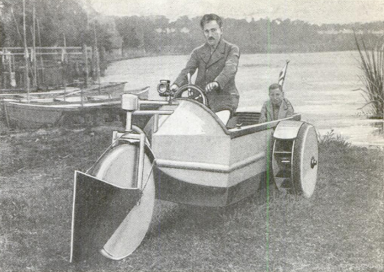 Комбинация автомобиля и лодки, недавно построенная в Европе, приводится в движение одними и теми же колесами, независимо от того, передвигается она по суше или по воде, при переходе с одной поверхности на другую не требуется никаких действий. Простота использования достигается с помощью лопастей, установленных на внутренних поверхностях двух задних колес и закрытых широкими "брызговиками". Кузов автомобиля напоминает корпус лодки. Спереди установлено одно колесо, как на мотоцикле. Это цельнолитое колесо, на котором установлен щиток, похожий на лодочный руль, используется для управления как на суше, так и на воде. Необычное транспортное средство управляется с помощью "морского" штурвала. Если