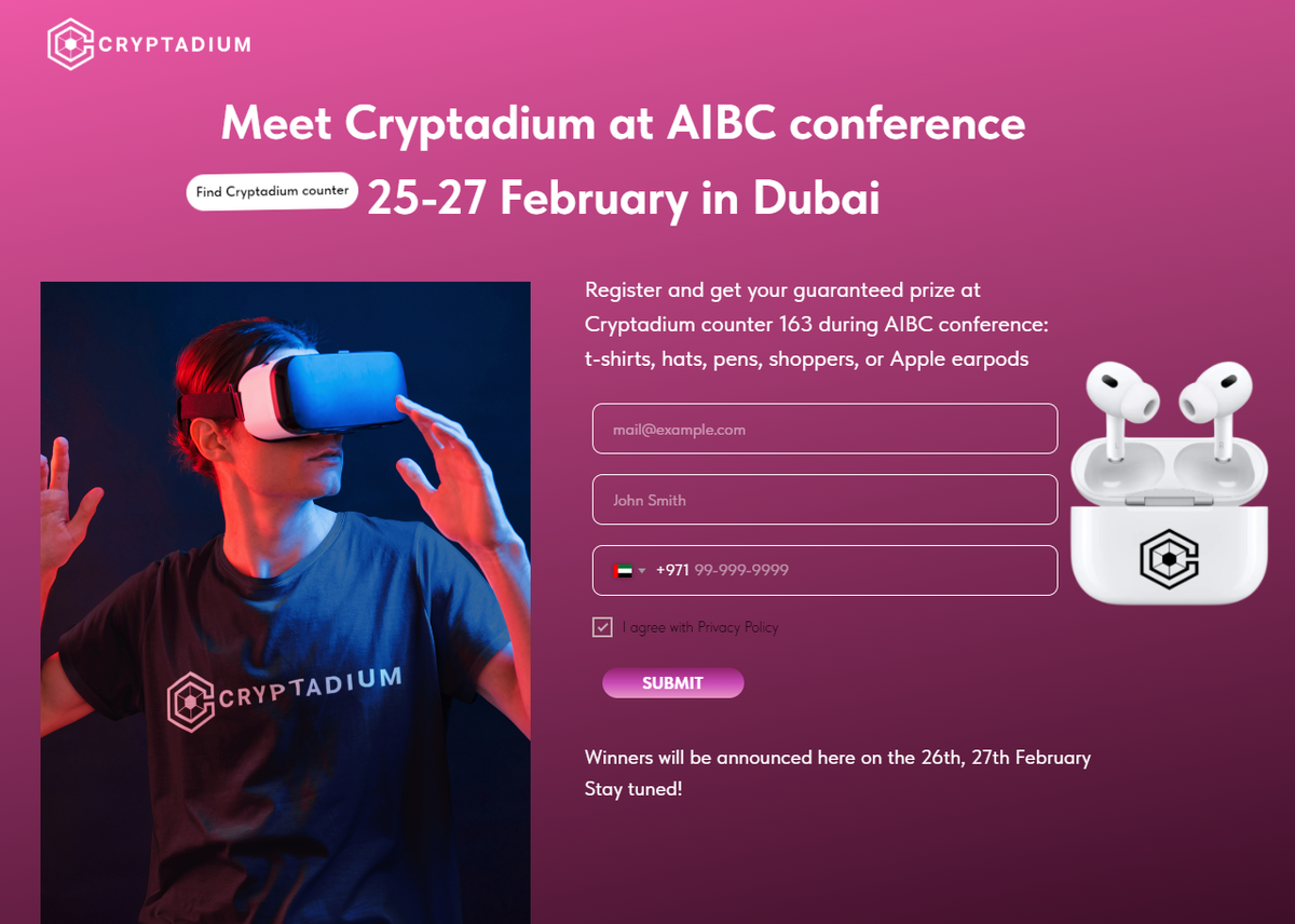 Хотите лично встретиться с нашей командой и узнать из первых уст о самом современном способе приёма платежей от клиентов? Тогда приходите на конференцию AIBC EURASIA 26 и 27 февраля, которая будет проходить в Дубае, в отеле Intercontinental Festival City, и ищите наш стенд №163. Конференция привлечёт ведущих представителей развивающегося технологического мира и планирует объединить политиков, разработчиков, руководителей высшего звена и юристов развивающихся секторов ИИ и блокчейна. Наша команда любезно расскажет об инновационном криптопроцессинге и продемонстрирует функционал платформы. Все активные гости стенда, которые сфотографируются с лого Cryptadium, выложат это фото в свой Instagram и отметят @cryptadium_processing смогут получить наш фирменный мерч (сумку-шоппер, бейсболку или футболку). Для этого нужно подойти к стенду и показать выложенное фото. Также вы сможете принять участие в розыгрыше шести наушников Apple с гарантированным призом. Зарегистрироваться на розыгрыш вы може