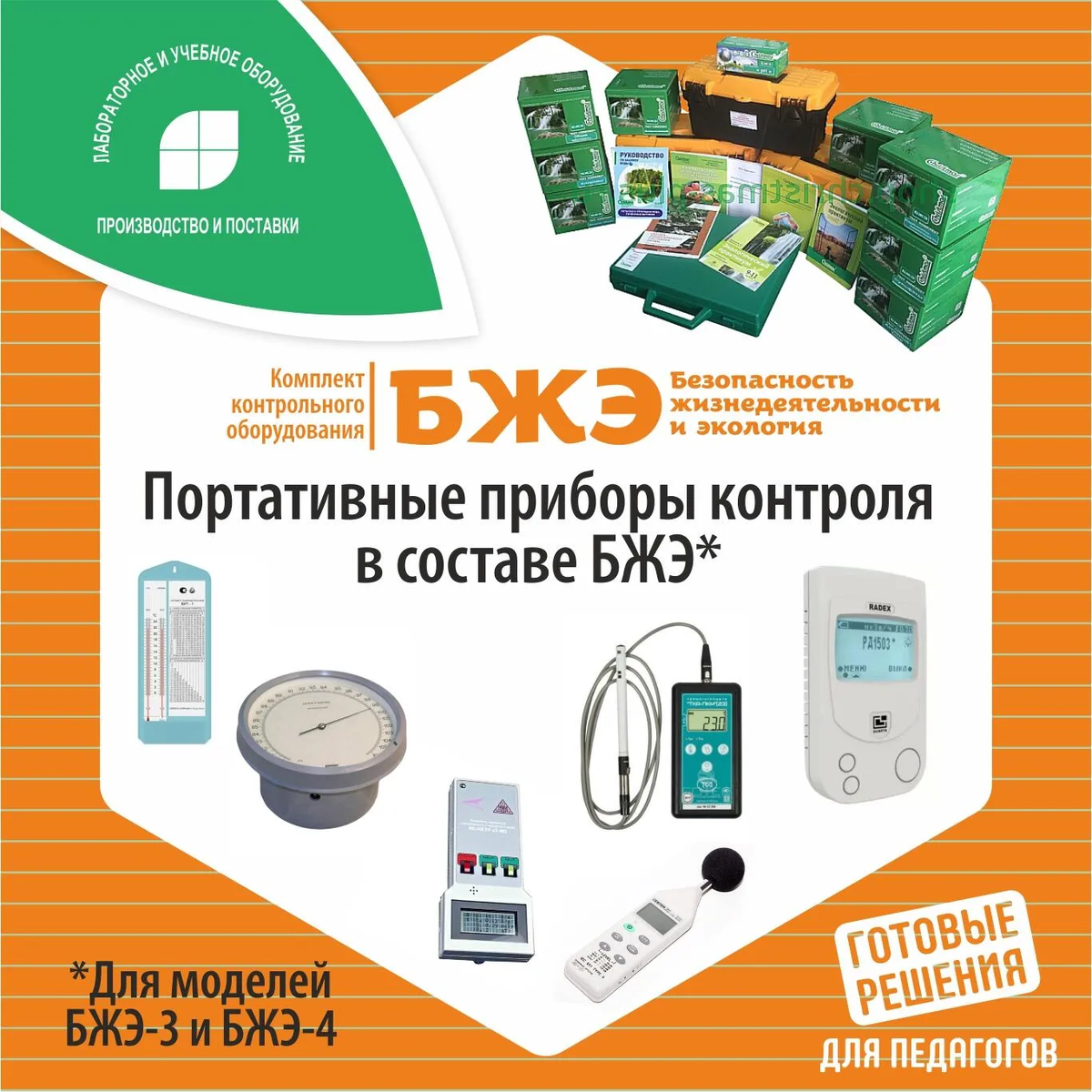 Портативные приборы контроля радиационных и физических свойств окружающей среды, входящие в комплект контрольного оборудования «Безопасность жизнедеятельности и экология» БЖЭ-3 и БЖЭ-4: ☻Барометр-анероид БАММ-1 Атмосферное давление в наземных условиях ☻Гигрометр психрометрический ВИТ-1 Относительная влажность воздуха и температура в помещениях различного назначения ☻Дозиметр-радиометр ДРГБ-01 «ЭКО-1» Радиационная обстановка путем измерения мощности дозы гамма-излучения и плотности потока бета-частиц, Удельная активность различных веществ, загрязнение местности, материалов, отходов и др. ☻Дозиметр «РАДЭКС 1706» или «СОЭКС» Мощность амбиентного эквивалента дозы Н (10) гамма-излучения с учетом рентгеновского излучения и загрязненность объектов источниками бета-частиц (продуктов питания, стройматериалов, почвы и т.д.) ☻Измеритель параметров электрических и магнитных полей ВЕ- метр-АТ-002 Общий электромагнитный фон в помещении, поиск источников интенсивного электромагнитного излучения, атте
