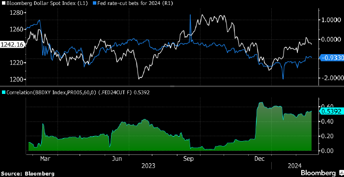 В середине января рынок производных инструментов учитывал в ценах снижение ставки по федеральным фондам в текущем году на 2%, тогда как сегодня этот показатель составляет уже меньше 1%. Более того, некоторые эксперты и вовсе видят вероятность того, что следующим шагом ФРС станет не снижение процентных ставок, а их повышение. Вверху: индекс доллара BBDXY (белым, левая шкала) и ожидания рынка производных инструментов по изменению процентных ставок в США в 2024 году (голубым, правая шкала, в %), внизу: корреляция между ними. Источник: Bloomberg В последние дни доллар подешевел против основных валют, однако в ближайшие месяцы он может заметно подорожать. На приведенном выше графике видно, что в середине января рынок производных инструментов учитывал в ценах снижение ставки по федеральным фондам в текущем году на 2%, тогда как сегодня этот показатель составляет уже меньше 1%. Но и это не все: некоторые эксперты и участники рынка видят пока незначительную, но все же вероятность того, что сле