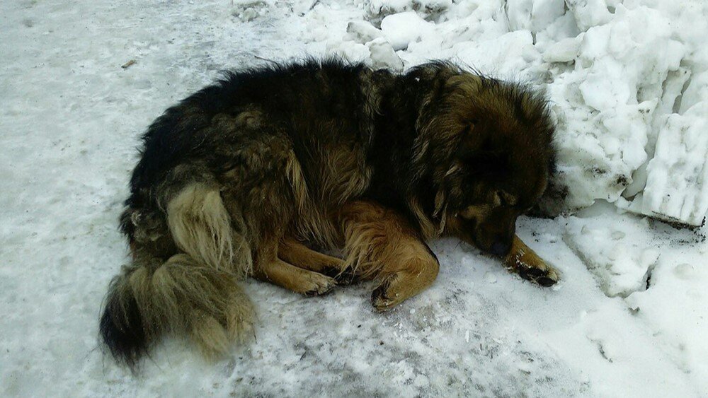 Одним предновогодним утром Андрей собрался на улицу выбросить мусорный пакет и подышать свежим воздухом. Когда мужчина подошел к мусорным бакам, то заметил смиренно лежащего пса, который был покрыт снегом. Было даже непонятно, жив пес или нет. Но четвероногий друг дал сигнал, приоткрыв глаза. Андрею стало так жалко бедолагу, что он мигом поторопился домой, чтобы взять старое одеяло, котлеты жены и воды, чтобы помочь пушистому товарищу.