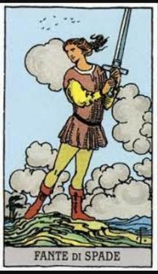 Роль 3 Паж Мечей и знак Зодиака Близнецы. В руках меч, рукотворное орудие в отличие от жезла. Меч - главное обозначение действий. Паж мечей деятельный персонаж. Ветер подгоняет его двигаться вперёд, но он оглядывается на предыдущих пажей. Какие именно действия характерны человеку в роли пажа мечей можно символически определить по расположению облаков (стихии воздуха) около головы, рук и ног на карте. Ноги особо выделены ещё и красными сапогами - быстрые перемещения с одного места на другое. Это я в роли пажа мечей, когда, например, мне надо собрать документы по городу за один день. Или сдать несколько зачётов, или разослать смс. Стремительность пажа мечей всё же обусловлена предыдущими пажами - он оглядывается на них, а значит ориентируется на то, чтоб у него были силы (как у пажа жезлов) и форма (как у пажа пентаклей). У пажа мечей роль быть таким как все, нормальным человеком, то есть культурным. Понятие культура простыми словами это ответ на вопрос, что принято в твоем обществе, а