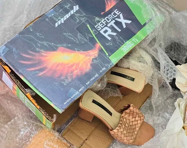 Несчастный и не мог предположить, что его на самом деле ожидало. По пришествию домой вместо желанного графического ускорителя он обнаружил в коробке лишь пару женских туфель, явно бывшего употребления.