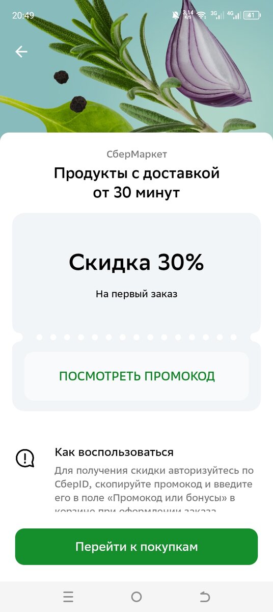 Воспользовалась предложением Сбербанка из рекомендации приложения и заказала товар на сумму от 1600 со скидкой 30% Заказ сделала в Пятерке Списали по промокоду обещанные 30% , доставка абсолютно бесплатная При заказе от 3000, скидка 1000 р Покупкой довольна , все свежее и целое ✔️