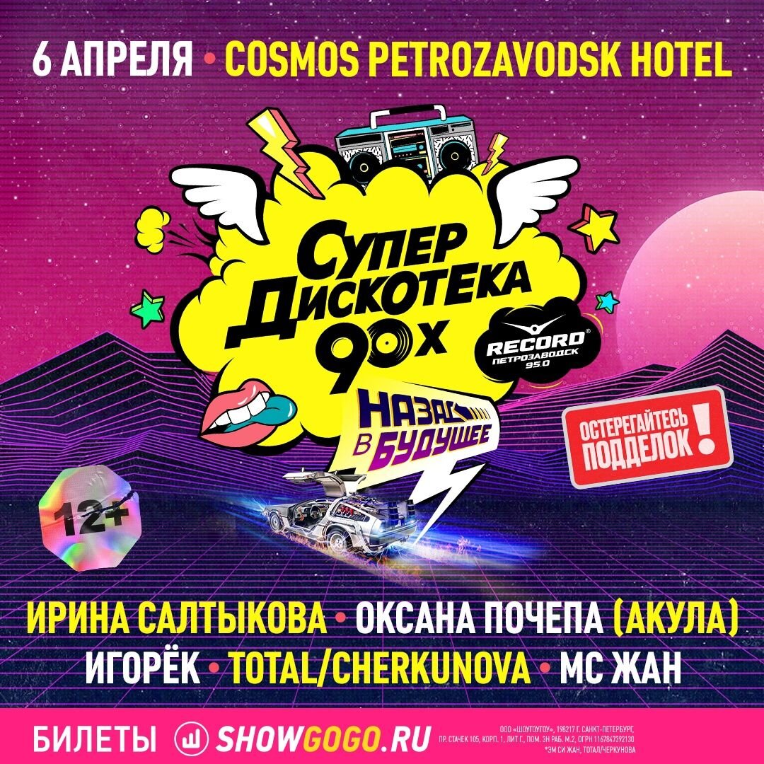 Ирина Салтыкова, Оксана Почепа Акула, Total/Cherkunova, Игорёк и MC ЖАН едут порадовать жителей карельской столицы постановкой «Назад в будущее» (12+)! А еще интерактивные зоны прямиком из детства и самая сумасшедшая атмосфера. Все это ждет нас 6 апреля в отеле «Cosmos». Супердискотека — первый и главный фестиваль музыки 90-х, существующий 20 лет! Его показывают на главных телеканалах страны, среди которых Пятый канал, Первый канал, Пятница и МУЗ-ТВ. Каждый год фестиваль представляет новую постановку. В 2024 зрители увидят премьеру шоу «Назад в будущее». И жители Петрозаводска смогут принять в нем участие. Между выступлениями артистов публику ждут специальные ностальгические видео на экранах. Также в программе анимационные зоны прямиком из детства! Только на Супердискотеке 90-х можно вернуться в класс любимой школы и посидеть за партой, подкачаться в советском спортзале или поставить чёлку в парикмахерской. Кульминация фестиваля — фирменный Супермикс! Дресс-код соблюдает большинство по