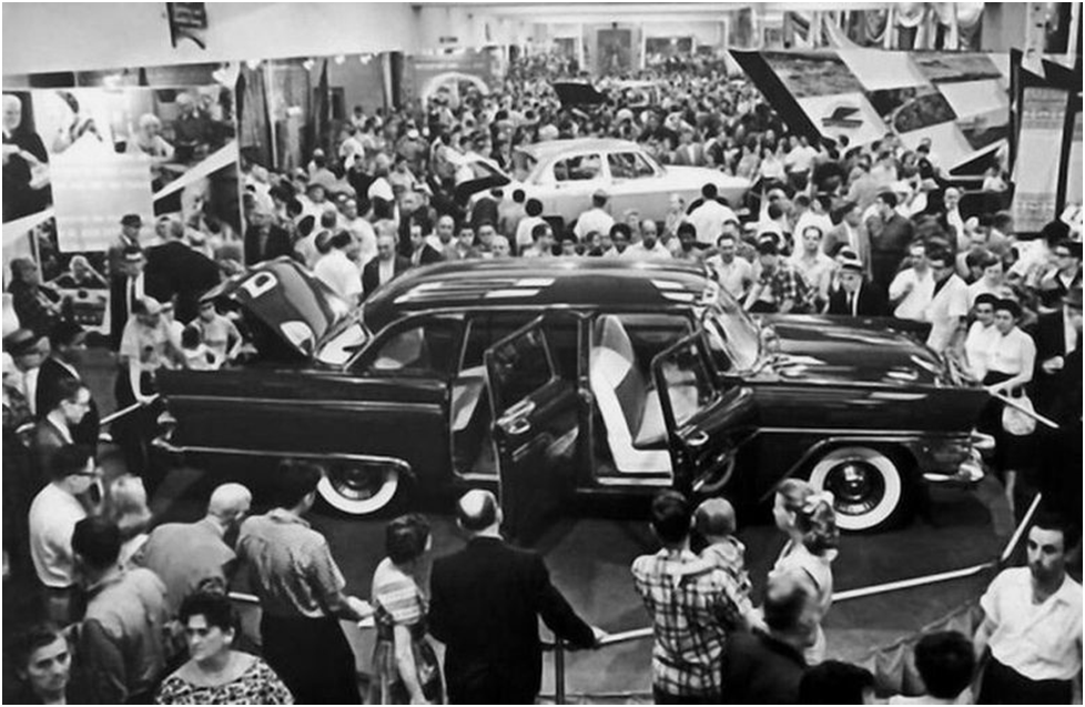 На этой фотографии запечатлен момент, когда «Чайка была показана на выставке в Нью-Йорке, в 1957 году. Видно, что американцы внимательно разглядывают этот автомобиль. Кто-то рассматривает багажное отделение, а кто-то салон. Кто-то фотографирует столь дорогостоящую и редкую машину.