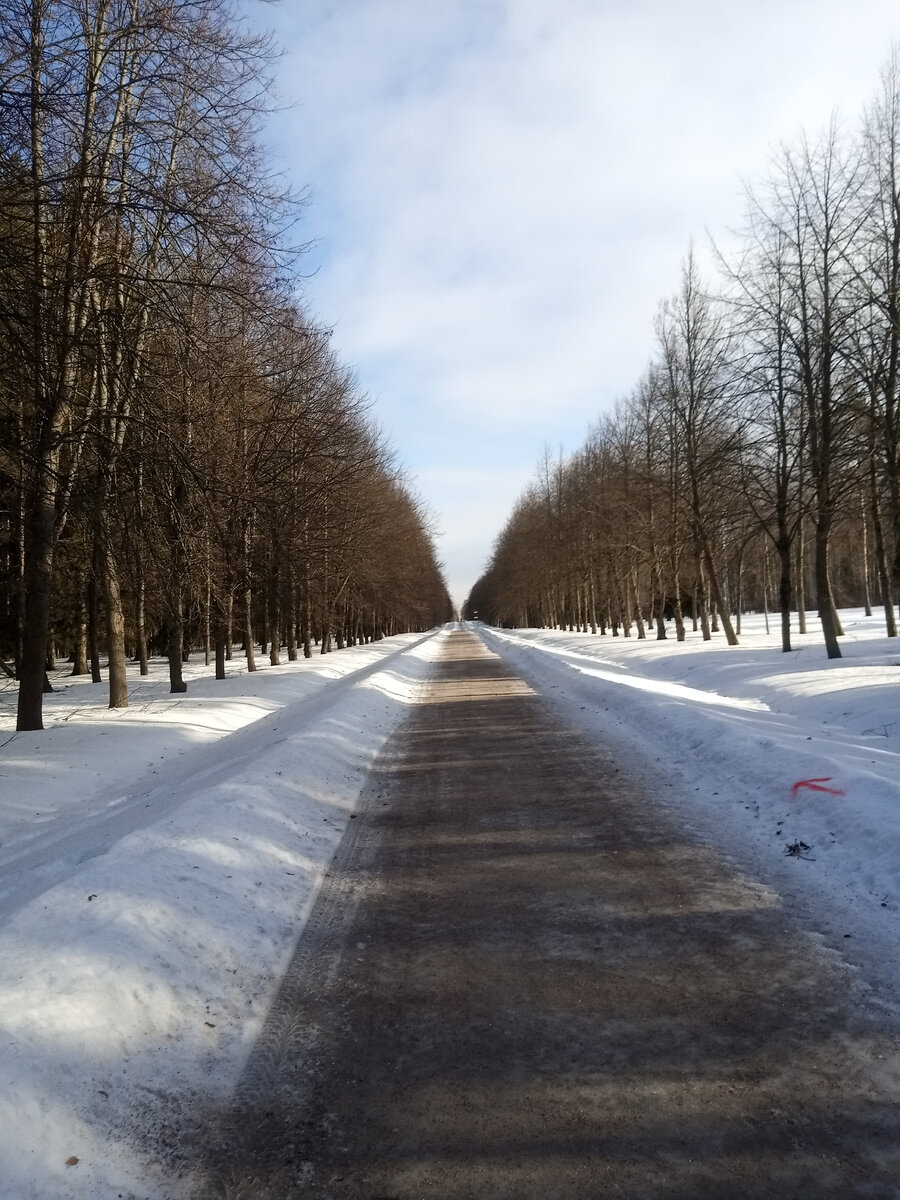 За алеей лес. Предположу, раньше здесь проводили конные прогулки. Я этот лес помню с осени - мне запомнились корни деревьев. Сейчас они скрыты утрамбованным снегом. Из леса выход ведëт на солнечную поляну. Здесь зимой гуляет ветер. Красивая прямая - открытое место. И до мостика.