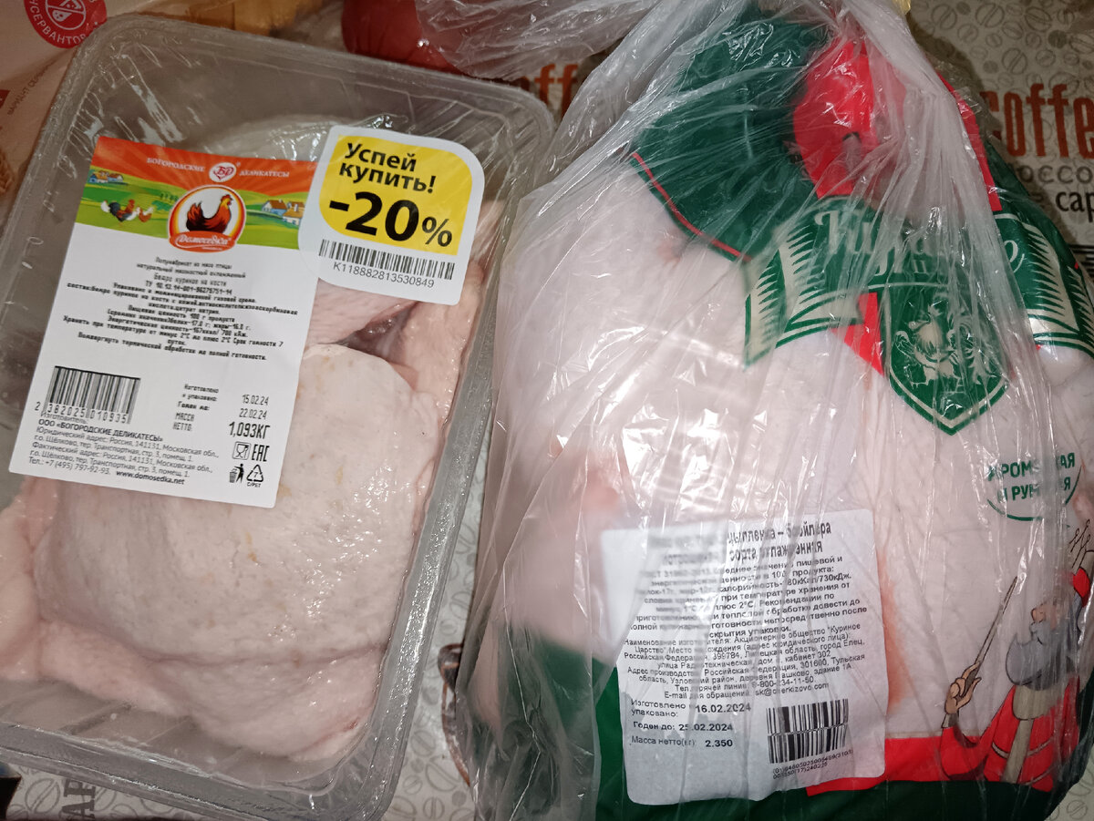 Курица. Как я уже когда-то говорила, в "экстре", большом магазине, всегда скидки на разные упаковки птицы и мяса. Обычно с истекающим сроком, вот и у лотка куриных бедер два дня в запасе осталось, но это не беда, сегодня приготовлю. Цена бедрышек до скидки - 210р/кг, тушка - 160р/кг.