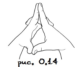 Вначале раскроем чакры рук. Когда почувствуете ток энергии, сложите пальцы в замок, оставив выпрямленными указательные пальцы. Подушечки больших пальцев должны быть сложены вместе и смотреть вниз (рис. 0.14). Задержитесь в этом положении на несколько вдохов и выдохов, а затем поместите большие пальцы между ладоней так, чтобы каждый палец касался чакры ладони другой руки. Опустите руки на колени и обдумайте все, что узнали о своих указательных пальцах, и, следовательно, о своем характере. И хотя, возможно, откроются некоторые нежелательные черты и качества, примите их как часть того, кем вы являетесь на данный момент, зная, что вам по силам изменить свою жизнь. Сосредоточьтесь на положительных качествах и несколько раз повторите что-то наподобие: «Возможно, я застенчив, но уверен в себе и следую своему призванию», или «Я сильна, независима и сама несу ответственность за свою жизнь», или «Я больше не позволю (своему эго, другим людям — вставьте необходимый вариант) управлять моей жизнью»
