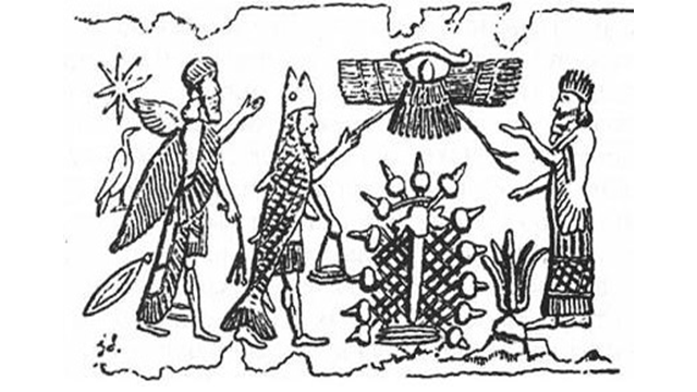 Беросс: первую книгу, книгу о творении ещё до потопа, примерно 5500 л.н. написал Мусарус Оан Аннедот. Вот как его изображали (фигура в центре).