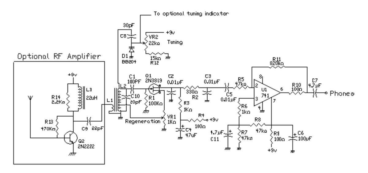 Добрый день дорогие друзья. Я продолжаю перебирать и подчищать свои архивы, и вот мне попалось описание радиолюбительского регенеративный радиоприемник на диапазон 49м, который на мой взгляд может заинтересовать моих читателей, и который они легко смогут повторить ввиду простоты конструкции. Схема приемника Особенностью схемы являются две дополнительные опции, это антенный усилитель на транзисторе Q2 и линейный светодиодный индикатор настройки на микросхеме LM3914 к переменному резистору настройки VR2 В качестве УНЧ используется универсальный интегральный операционный усилитель второго поколения на биполярных транзисторах 741 Схема индикатора настройки Транзистор Q3 подключен по схеме общего коллектора и поэтому обеспечивает высокое сопротивление в цепи настройки варикапа, и не нагружает ее. В качестве УНЧ используется универсальный интегральный операционный усилитель второго поколения на биполярных транзисторах 741, с нагрузкой на головные телефоны, но я думаю что его вполне можно зам