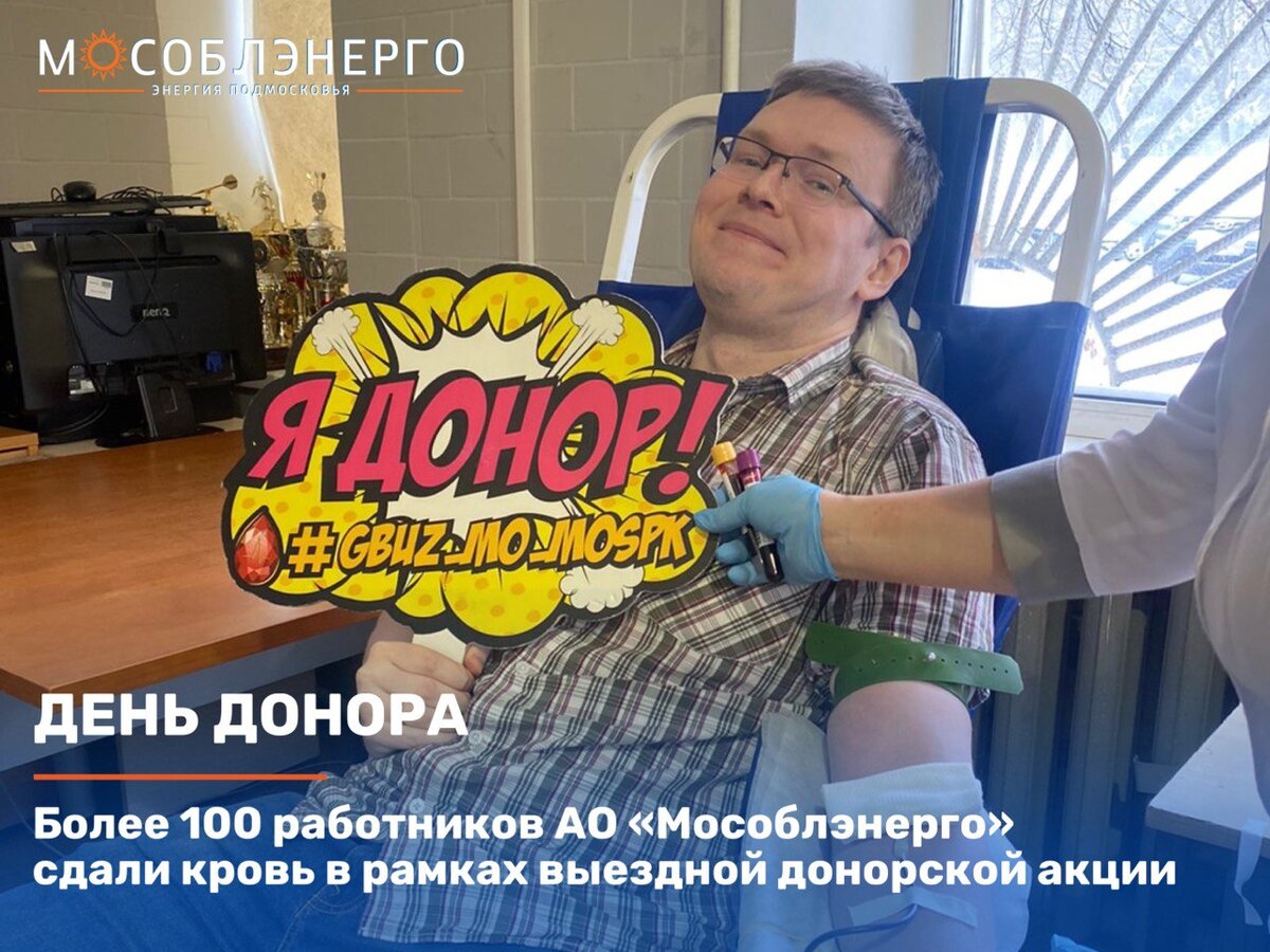 Работники АО «Мособлэнерго» продолжают добровольную сдачу крови и её компонентов в рамках выездной донорской акции, организованной Московским областным центром крови (ГБУЗ МО «МОЦК»). В феврале Дни донора были организованы в Коломне, Люберцах и Одинцово. Всего за данный период кровь сдали 110 работников компании. Суммарно на этих акциях было заготовлено более 40 литров крови. Перед процедурой каждый работник прошел обследование, по результатам которого была определена возможность забора биологически ценного материала. После самой процедуры участникам донорской акции был предложен сладкий чай с печеньем и произведена денежная выплата, предусмотренная законодательством России. Собранная кровь отправится в медицинские учреждения Подмосковья для лечения пациентов, которым необходимо переливание. Это больные с большими кровопотерями, ожогами в связи с несчастными случаями и ДТП, онкологические больные, пациенты с болезнями крови, больные, нуждающиеся в оперативных вмешательствах. Работники