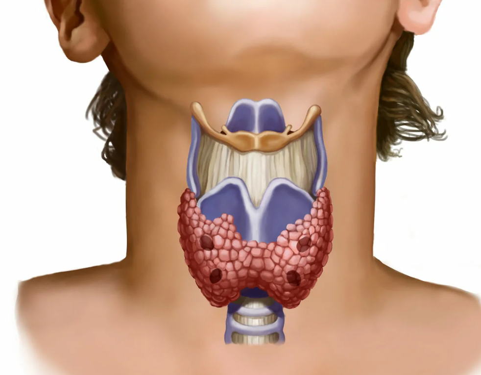 Отек шеи, затрудненное дыхание, боли при глотании и хриплый голос могут быть признаками увеличения щитовидной железы или появления уплотнений в ней в виде узлов.