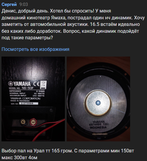 Вот такой вопрос прилетел мне в личные сообщения: Сейчас разберем, но сначала подумайте самостоятельно, сформулируйте свое мнение на этот вопрос, так будет интересней) Итак, имеем колонки Yamaha NS 50F, в которых два басовых динамика и один твитер: Вместо пострадавшего динамика планируется установить такое: Очень интересно, почему выбор пал именно на этот экземпляр?))) Кроме геометрического размера у него нет вообще ничего общего с родным ямаховским динамиком! Начиная от внешнего вида, заканчивая самим типом динамика. В напольной двухполоске на НЧ стоят вуферы, эту громкую эстрадную серединку вуфером точно назвать никак нельзя. Даже если выбирать чисто по внешнему виду, можно было бы подобрать гораздо более подходящую кандидатуру даже внутри Ураловской марки: Он и по сути больше подходит - это тоже чистый вуфер, который может играть низко. С ТТ всё понятно - это точно мимо, а вот можно ли вставить вместо ямаховского вархед? Нет, это нормально работать не будет. Смотрим, какая информац