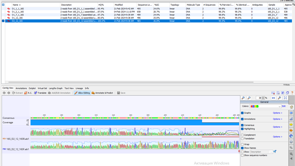 Поскольку мы выравнивали контиги, то тут их видим. По сути программа выровняла прочтения с обоих праймеров. Но это не совсем то, что нам нужно, потому что мы все-таки будем работать с выравниваниями консенусных последовательностей.