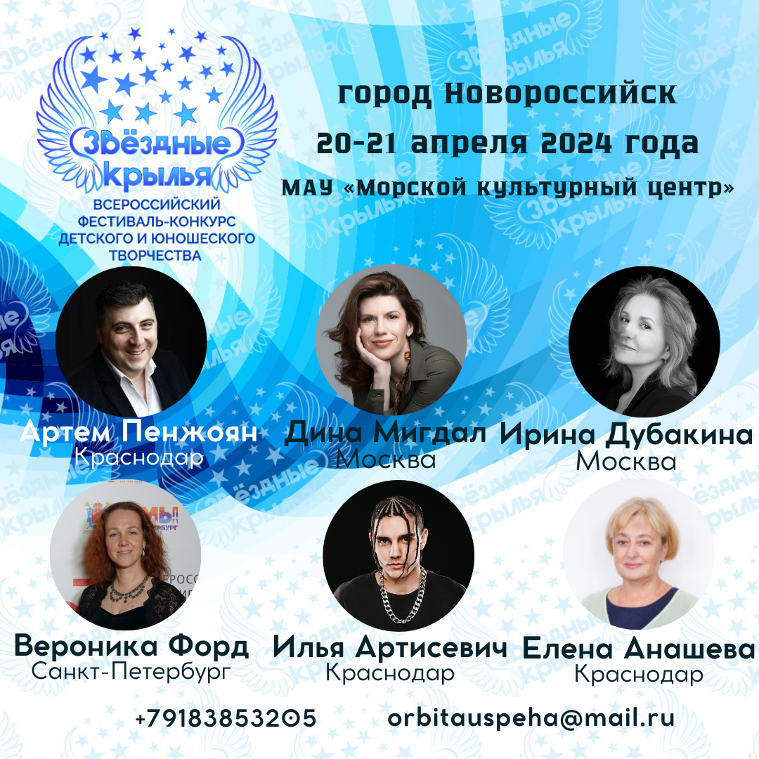 Всероссийский фестиваль-конкурс детского и юношеского творчества "Звездные крылья" стартует 20-21 апреля 2024 года в Новороссийске, в «Морском культурном центре»