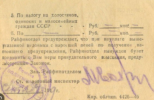 В 1949 году налог был увеличен для сельского населения: бездетные сельчане должны были платить 150 рублей в год, в то время как те, у кого был один ребёнок, - 50 рублей, а у двоих детей - 25 рублей в год. Лица, неспособные иметь детей по состоянию здоровья, освобождались от уплаты налога, также как и те, чьи дети погибли, умерли или пропали на фронтах Великой Отечественной войны.