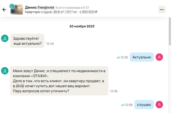 Опубликую реальную переписку с авито, которая состоялась 3 месяца назад. Риэлтор сразу заходит с козырей - мол у него уже есть покупатель. Задает вопросы, типа интересуется объектом. Хотя риэлтора интересует совсем другое, об этом позже. Во что бы то ни стало, хочет лично посмотреть квартиру. Про 50 000 рублей я возможно глупость написал. Просто на тот момент уже хотелось, чтобы он отстал. Кстати, про знакомую девушку, которая показывает квартиру - чистая правда. Хотя знакомой назвать ее сложно. Просто кинул клич в домовом чате, предложил 500р за показ - сразу же нашлось несколько желающих. Договорился с первой откликнувшейся девушкой. Она живет в моем доме, и никаких проблем с оперативным показом квартиры не было. Думаете, риэлтор будет оперативно показывать вашу квартиру потенциальным покупателям? ну-ну... - Видео есть? - Есть. Если бы его интересовало видео, то логично предположить, что он попросил бы его показать. Но его интересует не видео. Он хотел услышать от меня, что видео нет