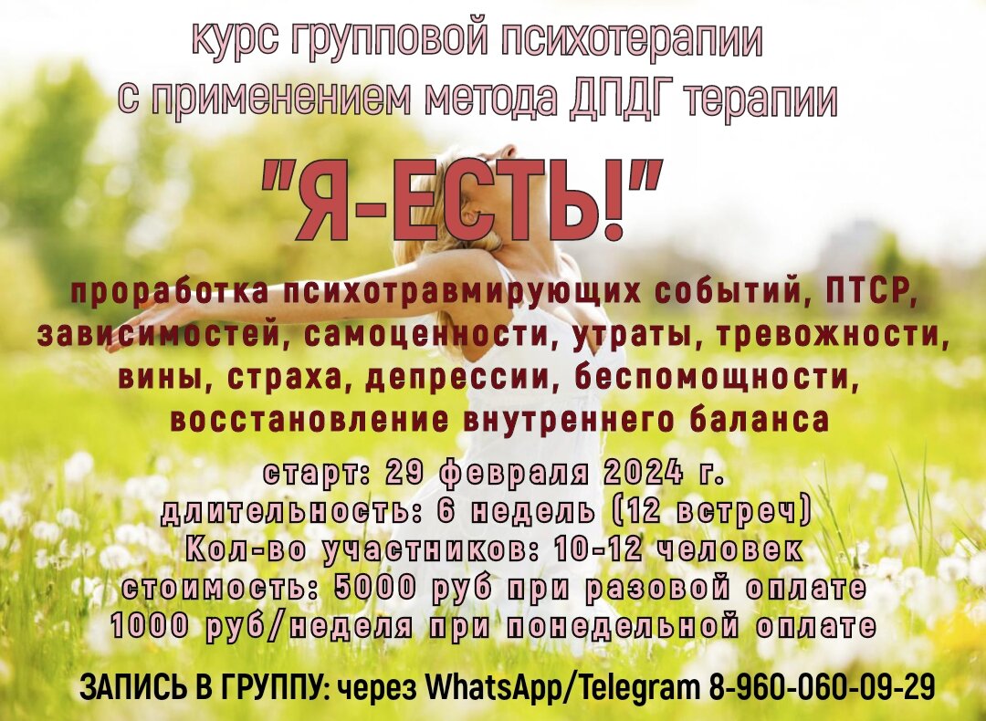 Потеряли себя? Нет смысла, цели в жизни? Не знаете, как жить, что делать? Находитесь в состоянии опустошения? Тогда этот курс психотерапии для вас! 29 февраля 2024 года стартует онлайн курс групповой психотерапии «Я-ЕСТЬ!» Длительность курса 6 недель (12 встреч). Количество участников ограничено! Группа 10-12 человек. Занятия проходят по четвергам и воскресеньям в 18.00 (по МСК). Длительность 1 встречи 1,5-2 часа. Для кого ценен курс? Для тех, кто: переживает ПТСР (посттравматическое стрессовое расстройство). В том числе любые травмирующие события, такие как смерть близкого человека, нападение, изнасилование, катастрофы, насилие, военные действия и др. тревожные расстройства, в том числе фобии, обсессивно-компульсивное расстройство (ОКР), паническое расстройство, вызывающее панические атаки сексуальные дисфункции депрессии зависимости психосоматика (соматические нарушения) расстройства пищевого поведения проблемы в семейных отношениях низкая самооценка, неуверенность в своих сил