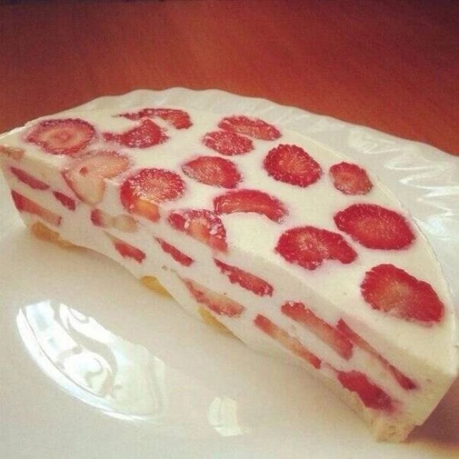 🍁 81.74 ккал/100 г 🍁 Б/Ж/У: 8.05 / 2.15 / 5.81 🍁 Ингредиенты: зернёный творог (0,5%) - 300 г молоко (0,5%) - 90 мл натуральный йогурт (у меня активия 0,5) - 30 г 3 взбитых "до пиков" яичных белка желатин быстрорастворимый в порошке - 25 г сахарозаменитель - исключительно по вкусу, у меня ушло 7 таблеток ванилин - на кончике ножа клубника (можно мороженную) - 250 г консервированные персики - 140 г Приготовление: Порезать персики и клубнику. На дно силиконовой формы выложить персики. Взбить блендером творог, молоко, йогурт, сахарозаменитель и ванилин. Внимание: количество молока может меняться в большую или меньшую сторону, в зависимости от того творога, который вы используете. Взбить миксером до пиков 3 яичных белка. Примешать сначала ложкой, а потом миксером белки к творожной массе. Желатин погреть в микроволновке до растворения. Я это делаю на малой мощности, 4-5 раз вытаскиваю, перемешиваю и ставлю обратно. Желатин ни в коем случае не должен закипеть! Влить желатин в творожную