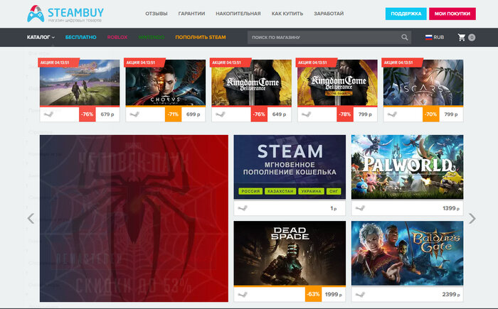 Еще один сервис, где вы сможете найти ключи к играм в Steam и Epic Games. SteamPay предлагает игры на любой вкус — от низкобюджетных до AAA проектов. Все это по довольно приятным ценам, что позволяет хорошо экономить на покупках игр по сравнению с тем же Steam. Самые популярные и актуальные проекты размещаются на главной странице, поэтому вы их точно не пропустите, и все игры разделены по категориям (мясо, магия, рогалик или стелс) и по жанрам.