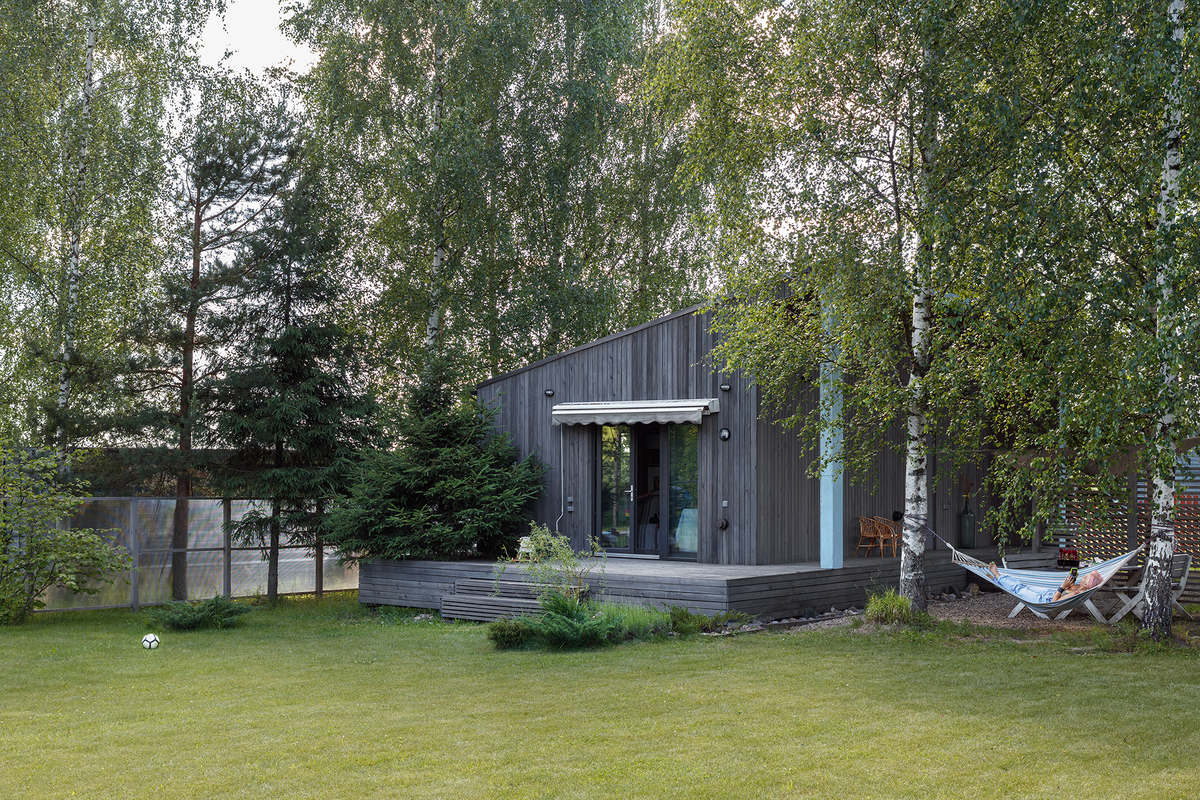 Екатерина Сванидзе спроектировала дачный дом на участке 25 соток в Ярославской области для себя и своей семьи. Территория «Архсарая» вплотную прилегает к фермерскому лугу, за которым находится лес. «Дом каркасный, фасад обшит планкеном из красноярской лиственницы, — рассказывает дизайнер. — Его площадь — 41 кв. метр. Мне хотелось, чтобы он не привлекал лишнего и внимания и был гармонично вписан в окружающий пейзаж». Высота потолка в максимальной точке — 4 метра, в минимальной — 2,5. За счет объема пространство кухни-столовой при своей небольшой площади не кажется тесным. В теплое время года двери на террасу почти всегда распахнуты. Над ванной расположена «лежанка», «наблюдательный пункт» и любимое место игр детей. Все внутреннее пространство отделано лиственницей, окна обрамлены в деревянные рамы, финские двери с дополнительной звукоизоляцией выполнены из сосны. Терраса ориентирована на луг и лес за ним. «Иногда оттуда приходит лисица, обнюхает, осмотрится и удаляется, — рассказывает Е