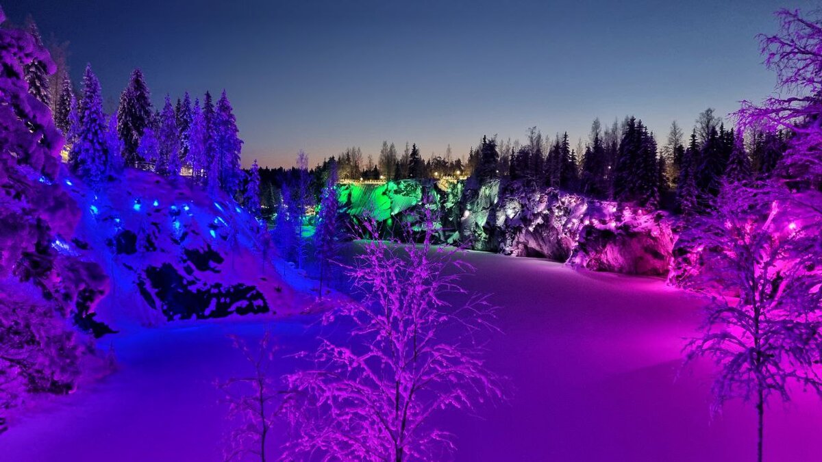Горный парк Рускеала — одна из главных достопримечательностей Карелии. Здесь вы увидите затопленный мраморный каньон, итальянский карьер со следами от добычи мрамора, можете отправиться к водопадам, посетить мастер-классы, экскурсии, кафе и сувенирные лавки. Зимой карьер подсвечивается яркой подсветкой!