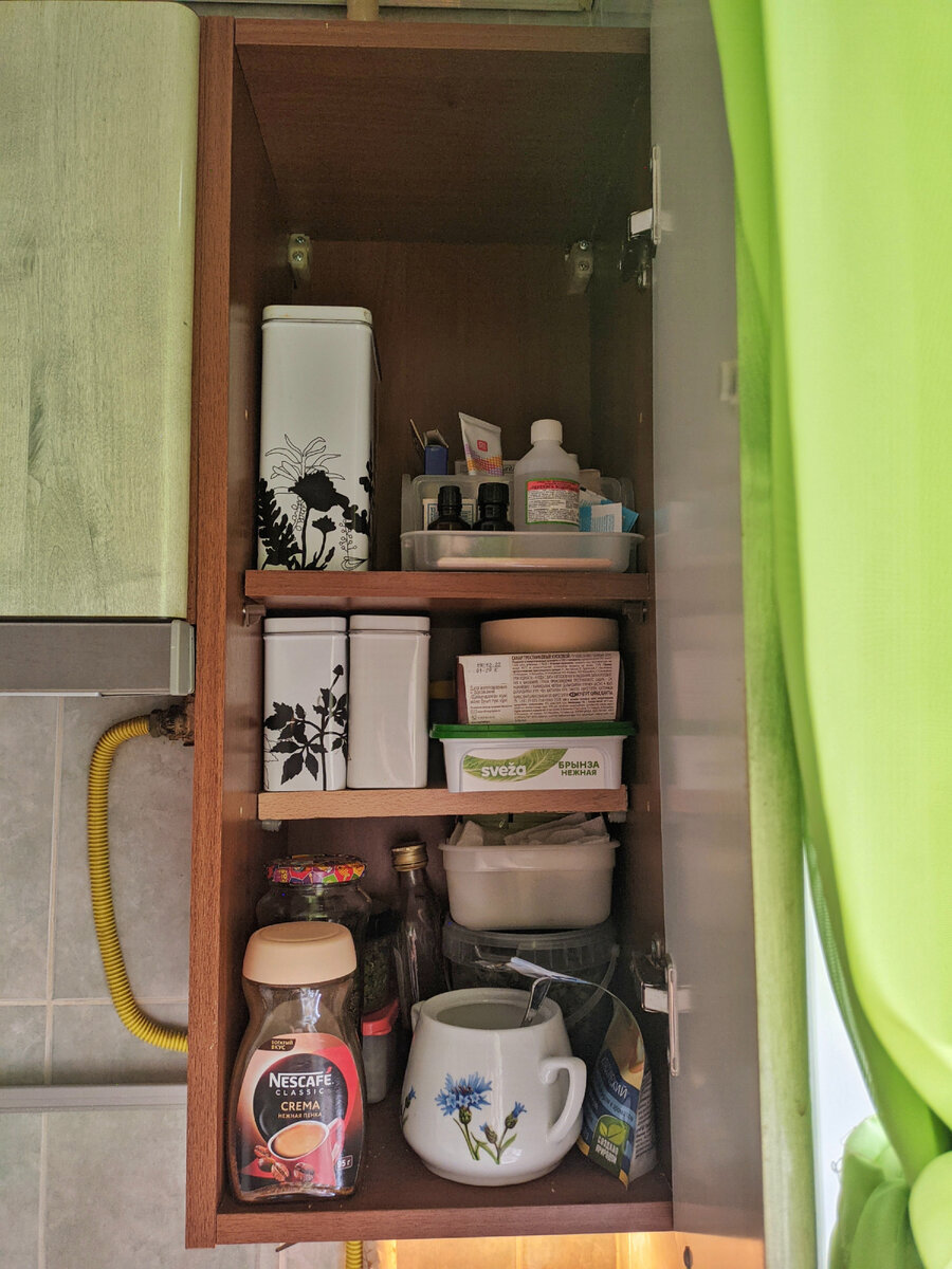 Начиталась я @Блондинка в доме . Она шкафчики разбирает. Ну, как же я такое пропущу? Конечно же мне тоже срочно надо пошуршать 😅. Начала с одного шкафчика. Вид до: Содержимое верхней полочки: В основном здесь были медикаменты и чёрный чай: В результате образовался мусор: Куда девать эфирные масла? Ну, лаванду я ещё иногда могу от моли на ватный диск капнуть, а жасмин? Вот этот товарищ тоже особо не востребован. Ещё при жизни свекрови родственники из Тайланда привозили: После разбора: Со второй полки: Тут у нас: Опережая вопрос - бумажный скотч здесь храниться, так как с его помощью я баночки подписываю 😊. Третья полка: В результате тудам-сюдама освободились: Травы переложила в другую свободную ёмкость . Цикорий пересыпала с банку из-под кофе. Вот этого товарища отправила на покой: Он тоже ещё свекровь помнит 🤦🏻♀️. В результате полка выглядит так: Чай-кофе-потанцуем на нижней и средней полке, на верхней - аптечка и семена/ягоды. Банки подписала, а то муж тут в выходные чай