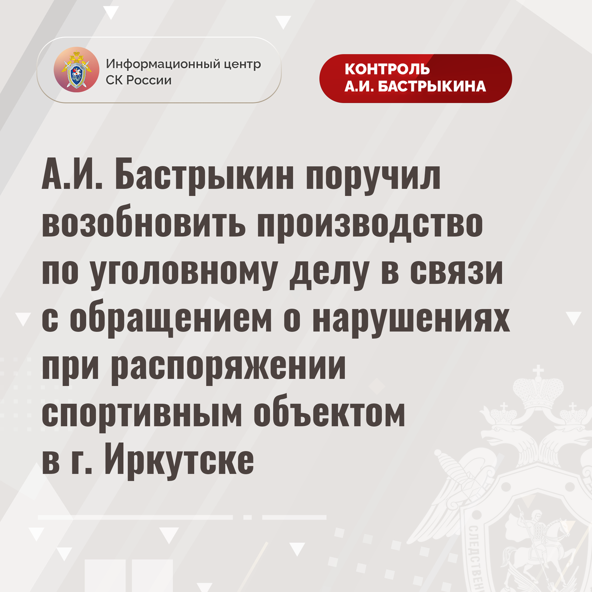 Председатель Следственного комитета Российской Федерации Александр Иванович Бастрыкин поручил руководителю СУ СК России по Иркутской области Анатолию Викторовичу Ситникову возобновить производство по уголовному делу, а также принять меры к завершению расследования в кратчайшие сроки и доложить о его результатах.
