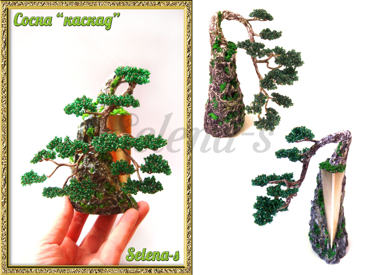 Бонсай сосны формы "каскад". Посажена в высокую тару - у меня крышечка из под духов, причем она дополнительно еще и загипсована под скалу. Сосенка сплетена по вдохновлялке. Размер - 12 см в высоту. Приступим! Начинаем делать пучки, одновременно сматывая их в ветку. Следующие ветки. И самые верхние. Подбираем тару и сажаем. Гипсуем, красим и декорируем. Расправляем - и любуемся! До новых встреч! 😘