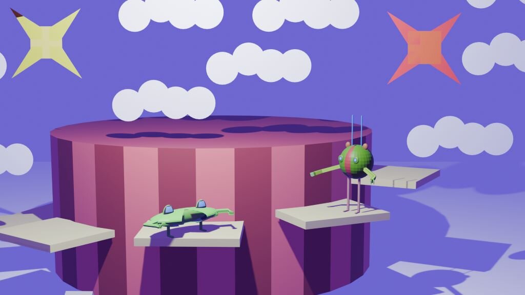Трехмерная сцена на сегодня. Прыгоид очень любит все исследовать. И его друг умноид тут тоже с ним. Они залезли на башню. В облаках. И прыгают там и все исследуют. Два таких забавных персонажа. Это может быть что-то типа упрощенного Марио, если подумать про игру.
