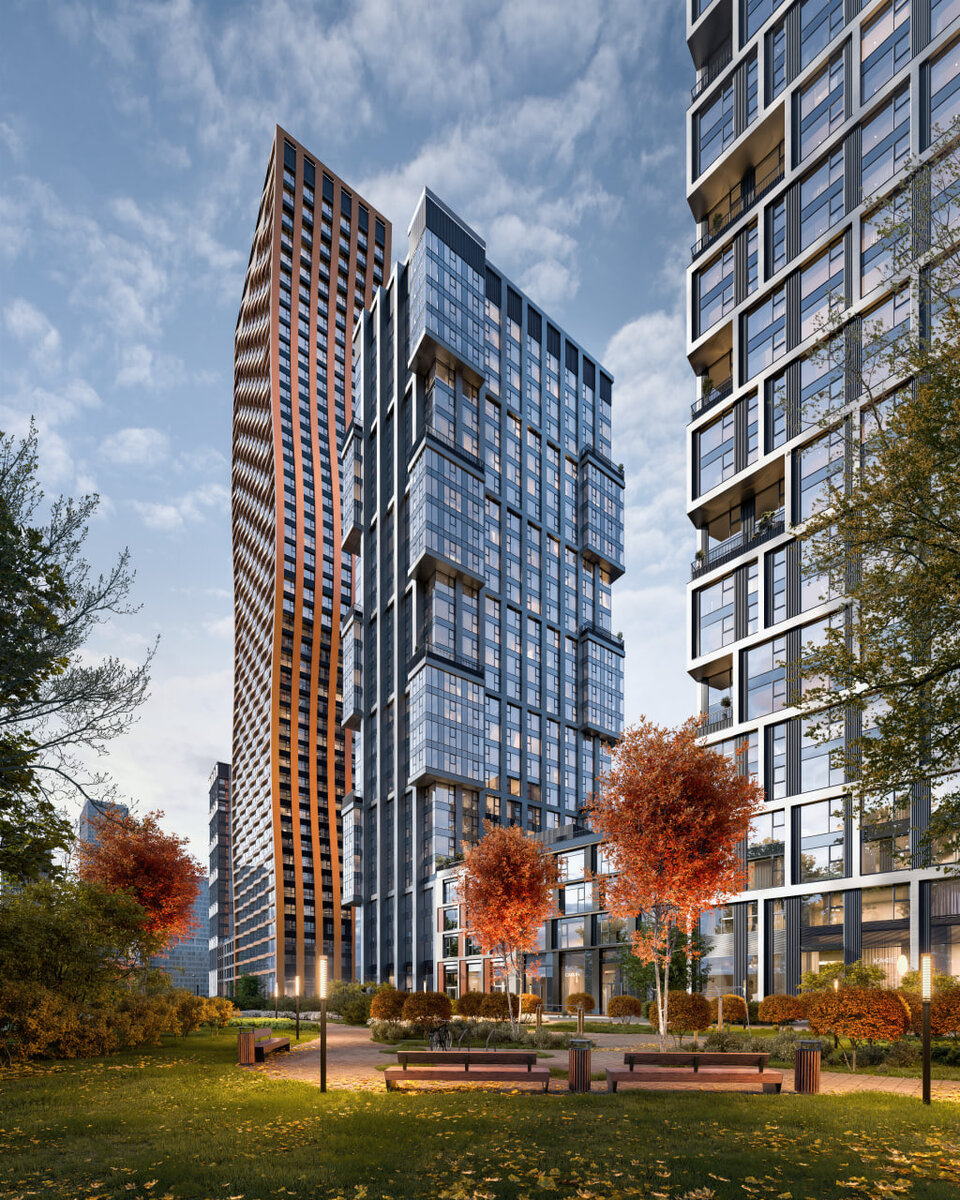 Идею ландшафтных дворов с функциональными зонами для отдыха и работы предложила команда дизайн-бюро GAFA, специализирующегося в области современной архитектуры, градостроительства и проектирования. Будущие жители смогут проводить максимум свободного времени на свежем воздухе. Для дружеских встреч создана комьюнити-гостиная с большим столом и стеной для трансляций с проектора. В спокойной тихой части двора в окружении зелени устроен бизнес-гарден. Эти зоны оборудованы wi-fi станциями и usb-разъёмами для подзарядки устройств. Для детей запланированы 4 игровых развивающих площадки c концепциями для разных возрастов: деревянный домик-шар в песочнице, «голубиные» башни, игровой каньон.