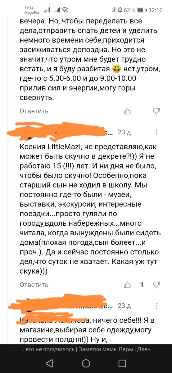 Я в комментариях под одной статьей написала, что мне скучно в декрете и что я хочу на работу. Конечно, нашёлся человек, который ответил "как это так может быть скучно в декрете?" Вместо того чтобы ходить на работу женщина предпочитает заниматься всем чем угодно в мире, потому что она такая активная! Я только понять не могу так почему бы на работу не выйти если сил немерено? А в волонтёры идти или быть курьером для мужа я не собираюсь и ещё я не стремлюсь идти в родительский комитет школы и даже в родительский комитет садика я не пойду. Есть люди-энерджайзеры, такие молодцы делают всё подряд, да вот кто им за это спасибо скажет? Уж лучше я пойду на работу, когда сын пойдёт в садик, чем буду хвататься за все дела мира и пытаться быть хорошей для всех подряд. Я если честно не представляю как вечером муж приходит домой и уставший выслушивает как там дела в приюте, как там дела в родительском комитете и что не так в уроках у детей (кто-то проверяет уроки у детей, кто-то нет, я как ра