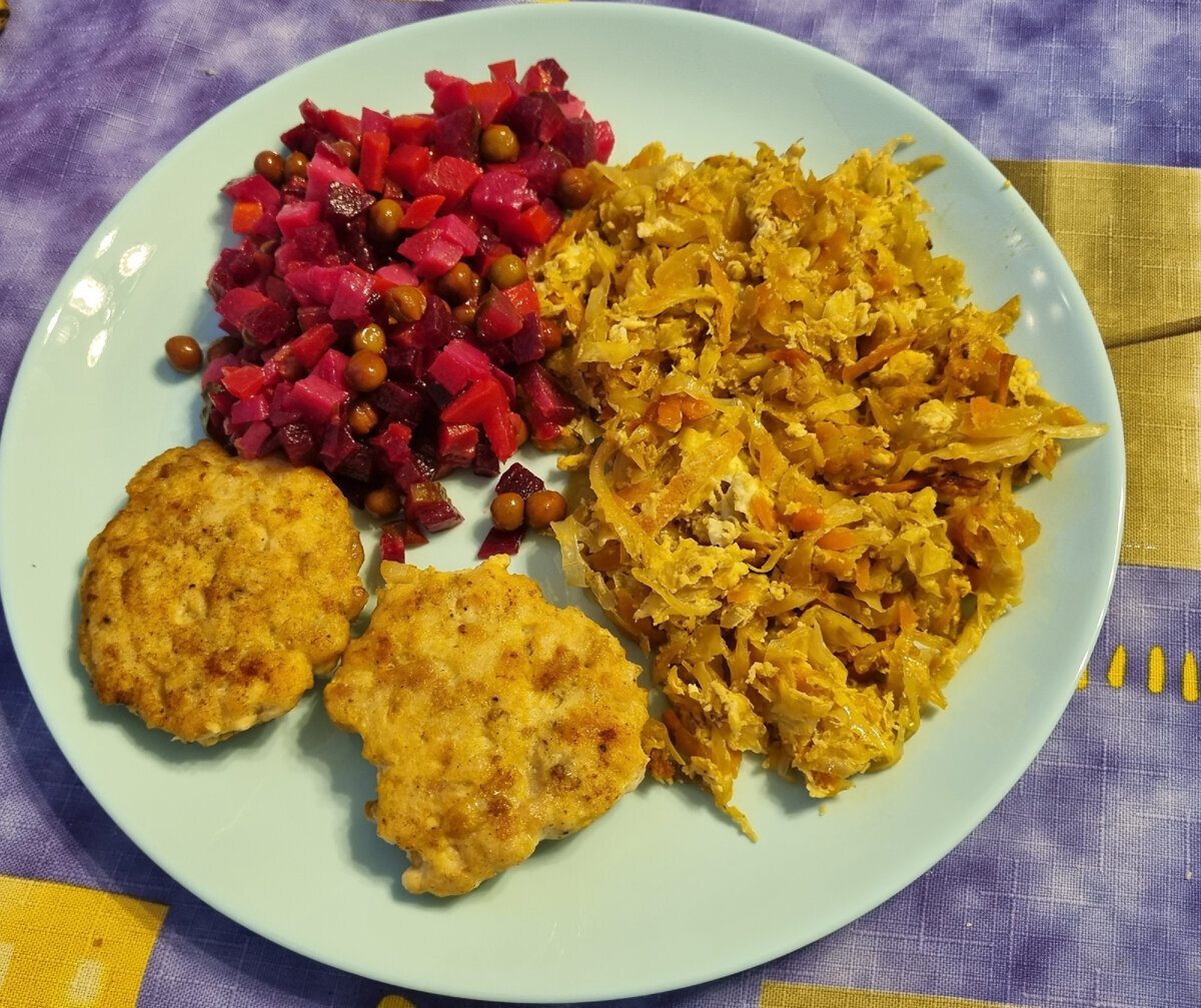 Нам надо: Полвилка капусты 1 луковица 1 большая морковка 3 яйца Соль, перец по вкусу Лук мелко режем, морковь натираем на крупной терке, капусту шинкуем. На топленом масле на небольшом огне томим лук, когда станет мягким, добавляем морковь, притушиваем немного, добавляем капусту и на маленьком огне тушим до готовности. Иногда я даже воду не добавляю, если капуста сочная, то она сама протушится в собственном соку. Если надо, добавьте немного воды. Когда капуста будет готова, вбиваем в нее 3 яйца и перемешиваем хорошенько и под крышкой доводим до готовности яиц.