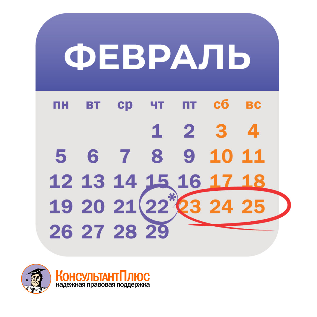 Напоминаем, что День защитника Отечества выпадает на пятницу – это выходной день. Таким образом, отдыхать будем 3 дня подряд — с 23 по 25 февраля. Перед праздником, в четверг, нужно отпустить персонал на час раньше. Как распределены выходные в 2024 году, можно посмотреть в производственном календаре в системе КонсультантПлюс. Открыть производственный календарь https://login.consultant.ru/link/?req=doc&base=LAW&n=449986&dst=100001%2C-1&date=21.02.2024&demo=1 Получить бесплатный пробный доступ к КонсультантПлюс https://login.consultant.ru/demo-access/ #консультантплюс #законодательство #новости_консультантплюс #праздник #производственныйкалендарь #какотдыхаем #23февраля
