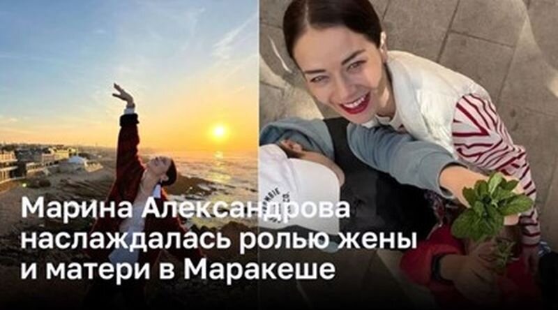 Марина Александрова провела незабываемый семейный отдых в Африке. Вместе с мужем и детьми они отправились в Марракеш, прекрасный город в Марокко, известный своими великолепными дворцами, садами и мечетями. Во время пребывания в Марокко, Марина не только наслаждалась мятным чаем и запахом специй, но и погрузилась в местную атмосферу, слушая звук азана, который призывает мусульман к молитве. Марракеш впечатлил актрису яркими цветами, теплом солнца и запахами, а также непрерывными волнами смеха.