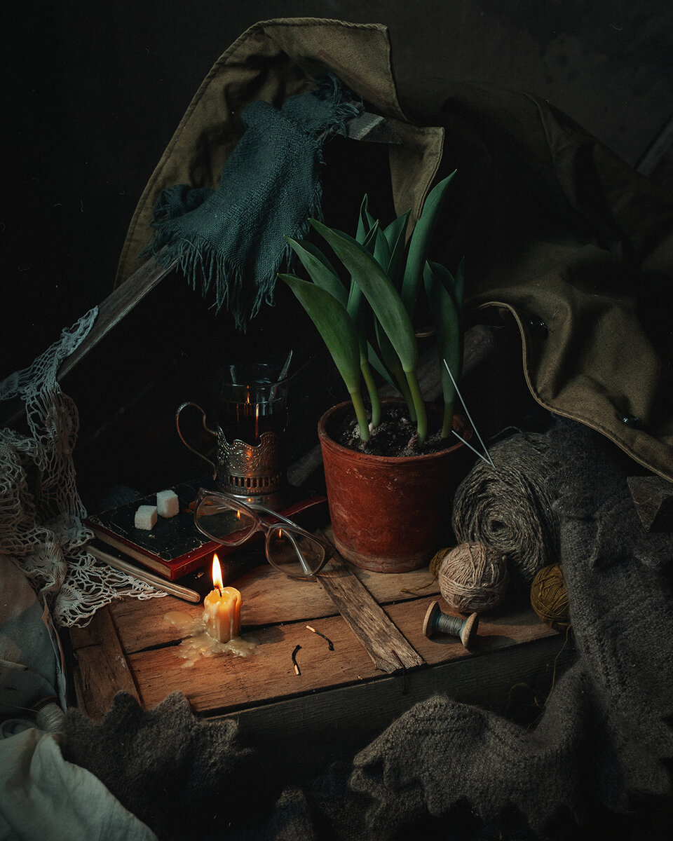 Февраль всегда был для меня месяцем колючих метелей и больших сугробов, темных и морозных ночей. Месяцем, когда хочется спрятаться в темный уютный уголок, закутаться в теплые одежды, напиться горячим чаем и ждать прихода весны. Все свои ощущения я попыталась изобразить в натюрморте. Бабушкины вещи создают для меня ощущение уюта и тепла дома. Вязание и книги неплохие занятия, чтобы скоротать долгие зимние вечера. Прорастающие тюльпаны как символ приближающейся весны. Взгляд очков направлен на свечу, которая символизирует здесь надежду на то, что скоро холода отступят и придет тепло. Чтобы усилить желание спрятаться от стужи, я накрыла натюрморт телогрейкой и шерстяной шалью. Вот такой уголок надежды получился для февраля месяца! И вариант с любимой моделькой.