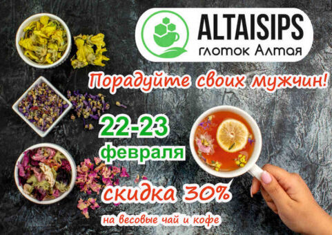 Дорогие наши ценители чая и кофе! У нас Вы можете выбрать готовые подарки к 23 февраля или собрать подарок на свой вкус и порадовать родных и близких. У нас большое поступление новинок — неповторимые ароматные сорта чая и кофе: Предлагаем вам многообразие травяных сборов и чаев, бальзамы и сладости от местных производителей. Только у нас вы можете выбрать любой весовой чай (черный, зеленый, фруктовый, травяной и др.) и заварить чашечку с собой. Мы хотим познакомить вас с разнообразными видами чая, именно поэтому проводим дегустации. Предлагаем вам более 30 видов кофе со всего мира и 120 видов чая. Будьте с нами и вы всегда будите первыми в курсе разнообразных акций, дегустаций, получите карту постоянного клиента. Ждем вас с радостью с 9-00 до 19-00 без обеда и выходных в Altaisips Глоток Алтая по адресу: г. Горно-Алтайск пр. Коммунистический д. 1/4 (во дворе ТЦ Ткацкий, рядом с Fix-Pricе). Телефон 89236615444, мы в Телеграмм https://t.me/altaisips