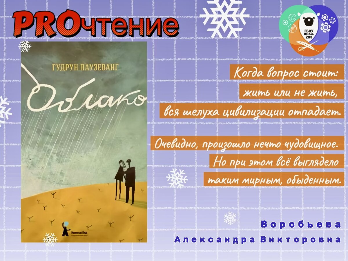 Традиционная авторская колонка от методиста нашей школы, журналиста с многолетним стажем, Александры Викторовны Воробьевой https://vk.com/sanechka78. 📖 Вчера перевернула последнюю страницу книги Гудрун Паузеванг «Облако». Сильная книга. Книга их тех, что еще долго не отпускают после того, как перевернута последняя страница. 🔸402. Именно столько ядерных реакторов действует в мире на данный момент. Прямо сейчас работают 402 атомных электростанции и строятся новые. 30 лет назад одна из таких АЭС взорвалась, более 8,4 миллионов человек подверглись облучению. Многие умерли сразу или в течение ближайших лет, кто-то прожил лет 10-15, кто-то жив до сих пор, но облучение всегда дает о себе знать. Это был Чернобыль, который сейчас представляет собой 30-ти километровую зону отчуждения. 🖍️ На основе этой реальной катастрофы и был написан роман «Облако», рассказывающий о вымышленной аварии на атомной станции в Германии. 🔸Как действовать в такой страшной ситуации? Вот скажите, вы знаете,