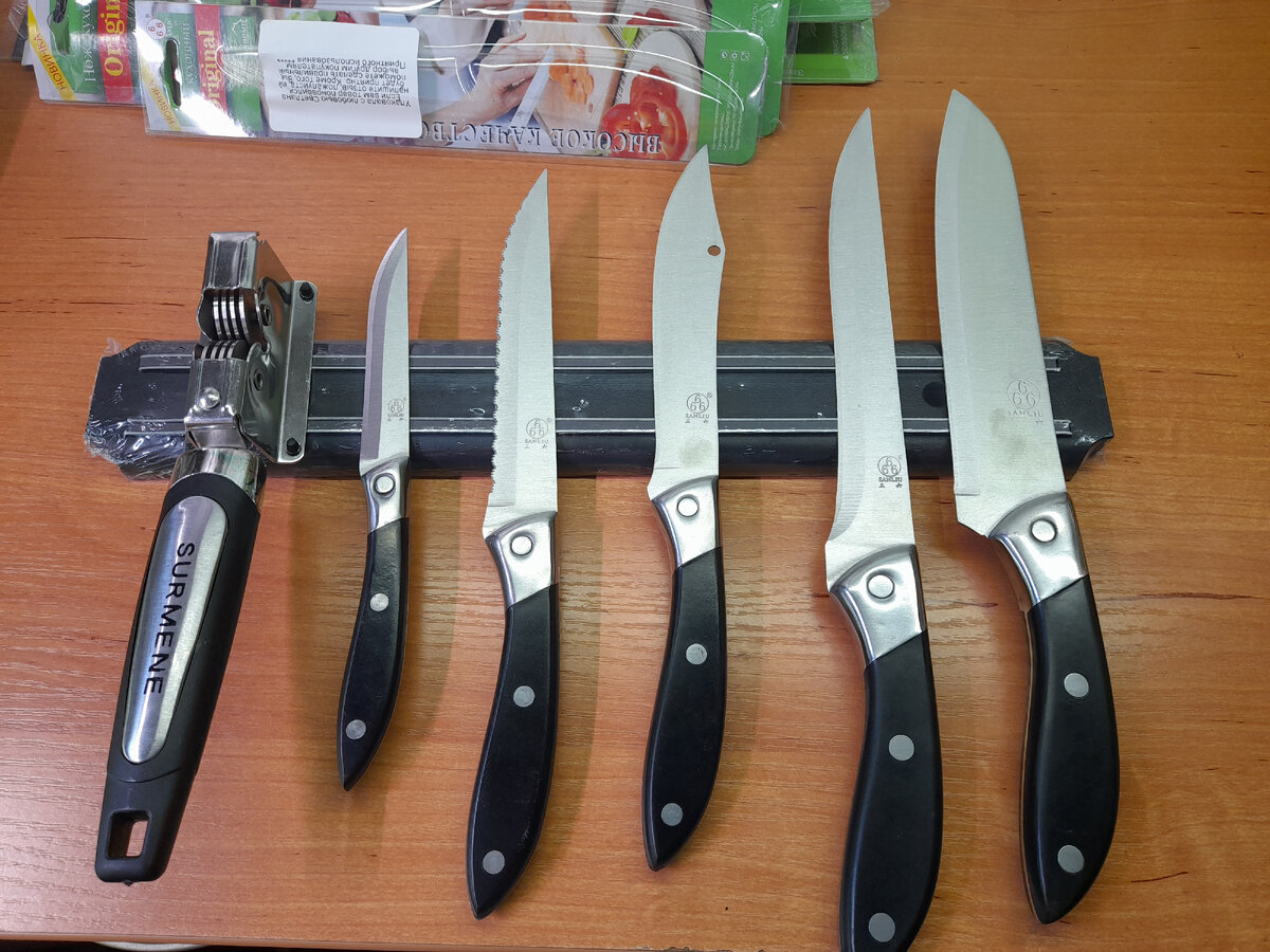 Для кухни-гостиной я уже купила все, что планировала. Среди последних покупок был набор кухонных ножей с магнитным держателем. С таким вариантом хранения ножей экономится место на рабочей поверхности. Ножи нормально заточены, ручка хорошо лежит в руке. Вот только точилка совсем не понравилась. Такими точилками мы не пользуемся, да и сделана она как-то коряво. Выбросили. На ее место повесим кухонные ножницы. На даче мы готовим в основном на индукционной плите. По праздникам и выходным можем побаловать себя блюдами, приготовленными на мангале или в казане. Для того чтобы разнообразить свое питание купили духовой шкаф. Он чуть больше чем микроволновая печь. Микроволновка у нас тоже новая, мы купили ее раньше. Микроволновка и мини-печь будут храниться в кухонном столе. Специально для них сделаем полки нужной высоты. Кухонные столы будем делать самостоятельно, а вот стулья приобрели готовые. Стулья я выбрала мягкие на металлических ножках. Сидеть на них очень комфортно, можно смело откинут