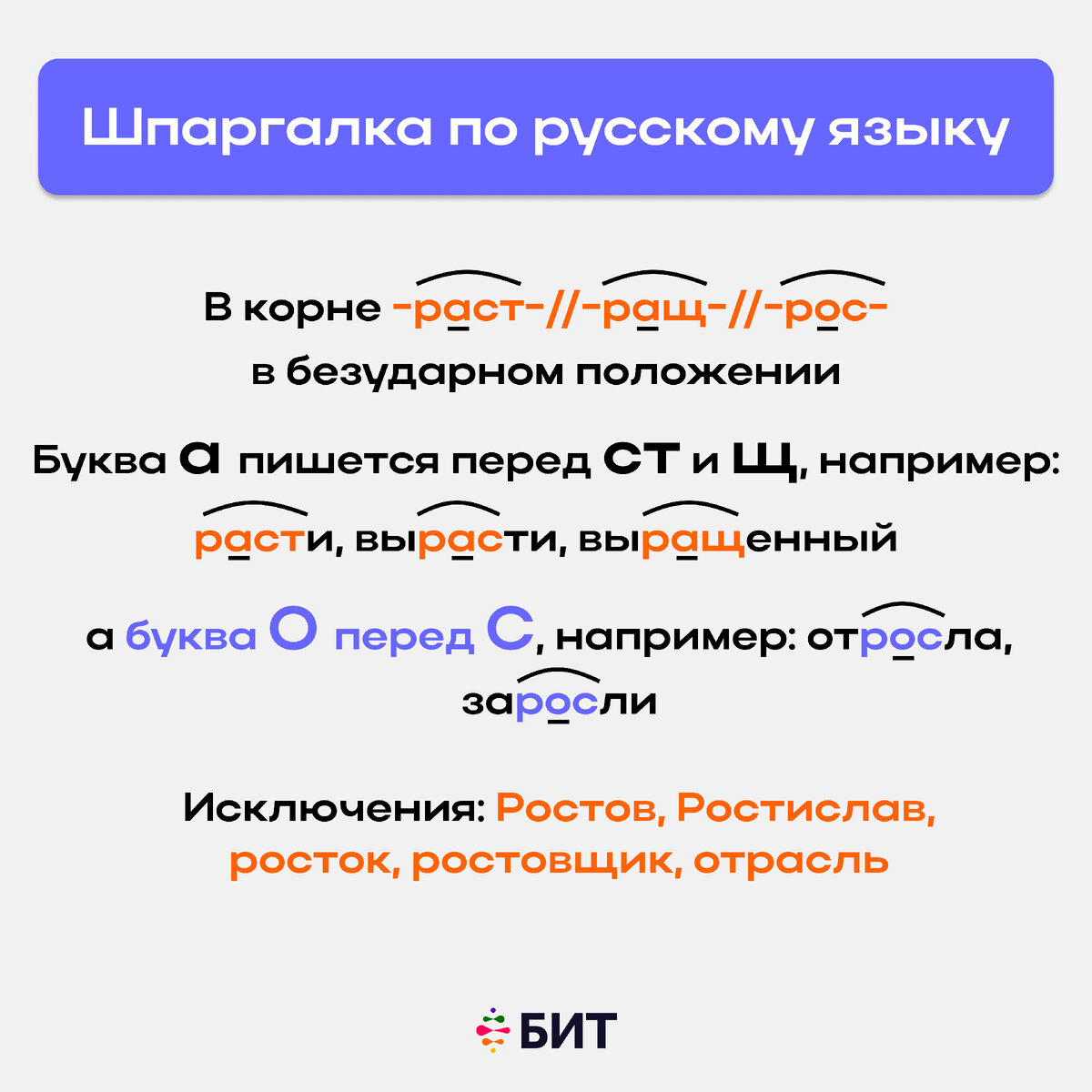 Как легко запомнить, какую букву А или О писать в безударном положении в корнях РАСТ, РАЩ, РОС, смотрите в карточке.