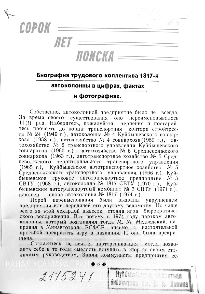 На днях в группе ВК Фотожурналист Николай Абросимов/ Старая Самара были опубликованы фото из Куйбышевской автоколонны №1817, поэтому поводу можно вспомнить её историю. Автоколонна №1817 добрую половину советского времени находилось в составе областного автотранспортного управления, а по началу (с конца 1940х гг) обслуживала стройтрест №24, затем была в составе Куйбышевского совнархоза. С 1966 года автохозяйство вошло в состав Средне-Волжского транспортного управления, которое в это же время было образовано путём объединения Транспортного управления Совнархоза и Куйбышевского областного автоуправления. Вот как описан тернистый путь наименований автопредприятия в проспекте "40 лет поиска", посвящённому а/к 1817 и изданном в 1989 году. В 1970-1980-х годах основной автомобильный парк состоял из дизельных тягачей: КамАЗ, МАЗ, Škoda-LIAZ. Кроме обслуживания предприятий Куйбышевской области, машины автоколонны покоряли и зарубежные трассы. В 1980 году в автоколонну 1817 прибыли на испытания н