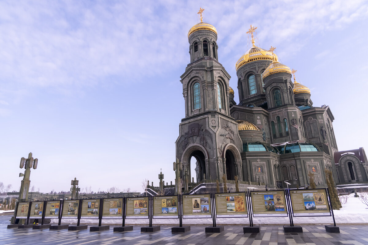 У входа в Главных храм Вооруженных Сил России открылась фотовыставка «Хранительница рубежей России» Российского военно-исторического общества, посвященной иконам Божией Матери, способствовавшим победам русского воинства на полях сражений.
